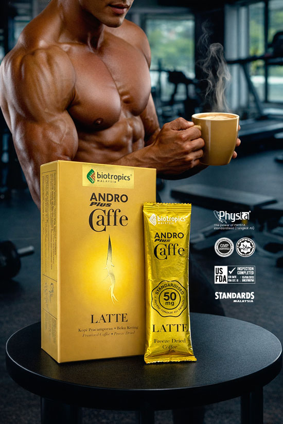 Andro Plus Coffee bukanlah sekadar minuman harian biasa, ia adalah gabungan inovatif yang menggunakan PHYSTA®, ekstrak berpiawaian tinggi daripada akar Tongkat Ali (Eurycoma longifolia). Melalui teknologi pemprosesan proprietari oleh Biotropics, herba tradisional yang telah lama menjadi rahsia kejantanan Melayu ini dipertingkatkan menjadi ekstrak yang kaya dengan kompaun bioaktif eurypeptides dan glycosaponins yang stabil serta konsisten kadarnya.
